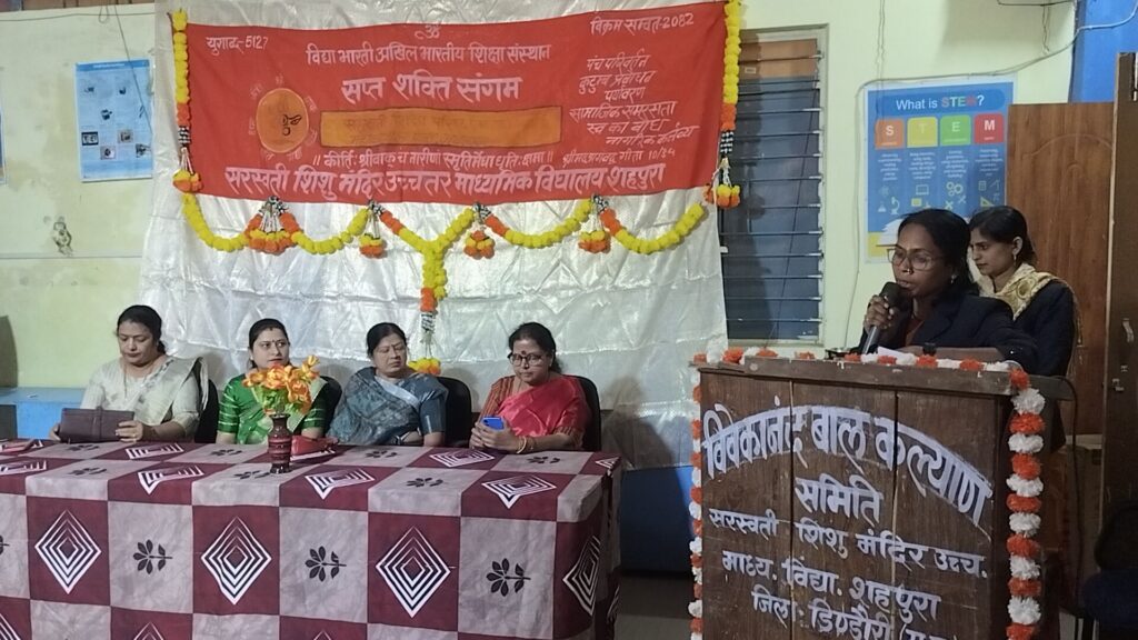 राष्ट्रीय स्वयंसेवक संघ के 100 वर्ष पूर्ण होने के उपलक्ष्य में इसके अनुशांगिक संगठनों द्वारा पूरे देश में विविध कार्यक्रम आयोजित किए जा रहे हैं। इसी क्रम में विद्या भारती अखिल भारतीय शिक्षा संस्थान के तत्वावधान में सरस्वती शिशु उच्चतर माध्यमिक विद्यालय, शहपुरा में “सप्तशक्ति संगम” विषय पर प्रेरणादायी विचार गोष्ठी का आयोजन किया गया।